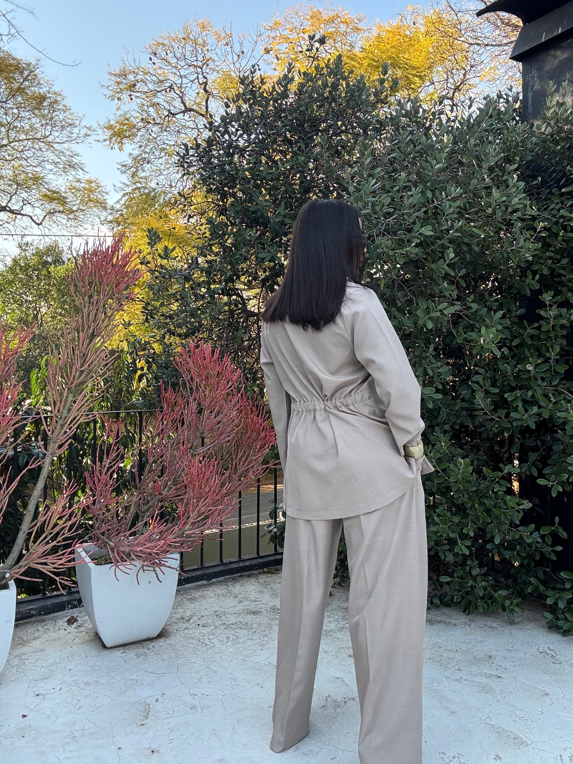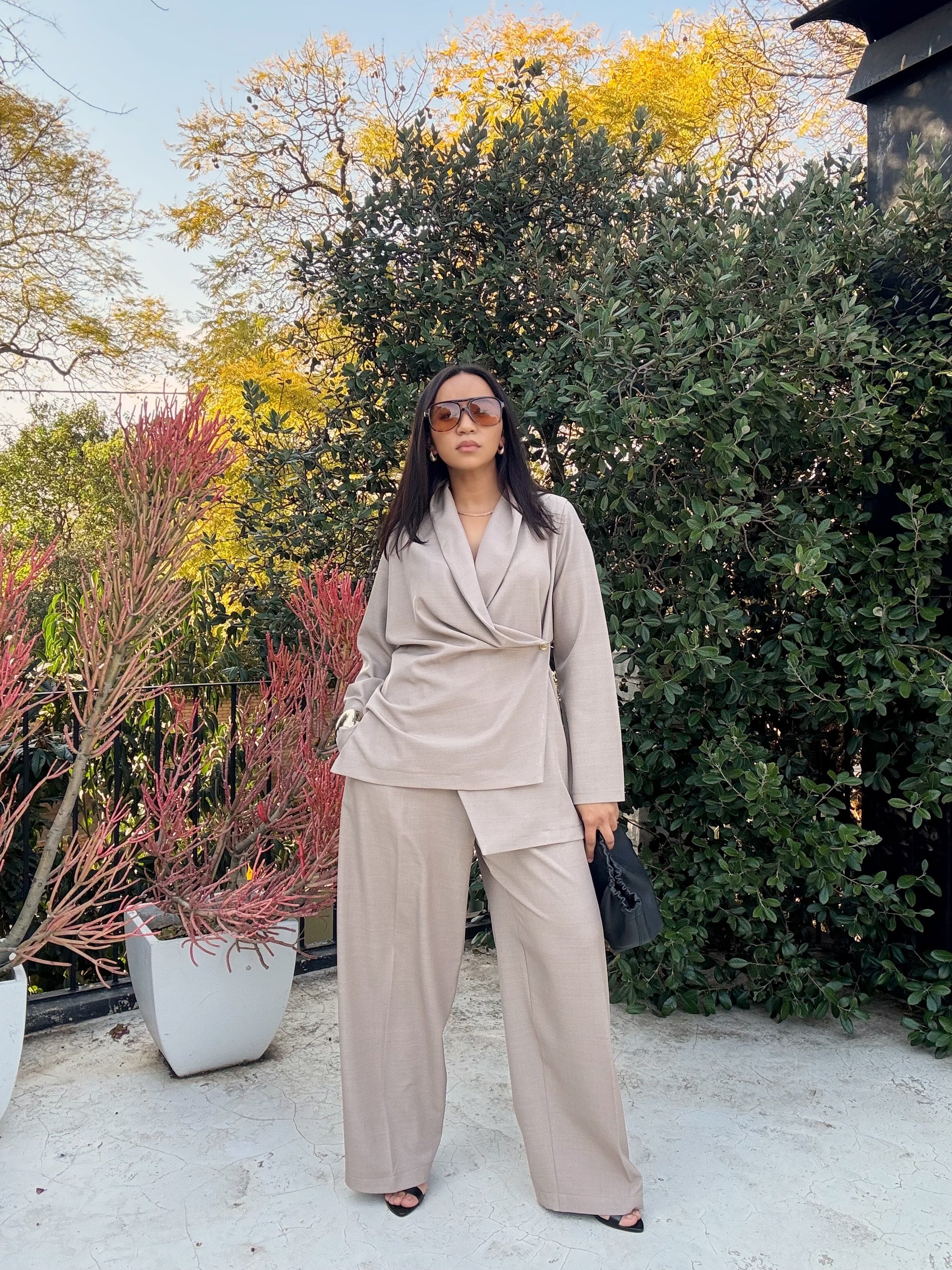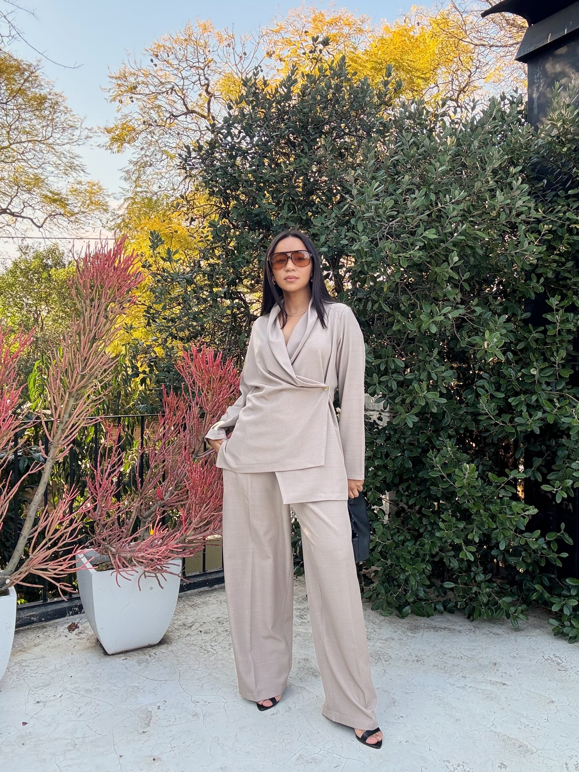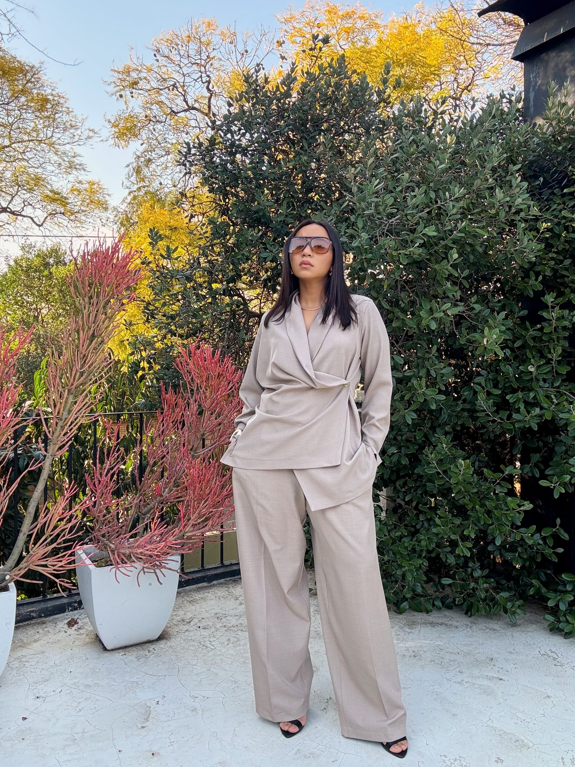 The COSS. Suit offers a refined look with its draped wrapped lapel blouse featuring a wrapped front and long sleeves for elegant coverage. The elasticated back and side slits provide flexibility and comfort throughout the day. Complemented by matching tailored pants with front pleats and practical side pockets, this ensemble delivers both style and functionality, perfect for making a confident statement wherever you go.