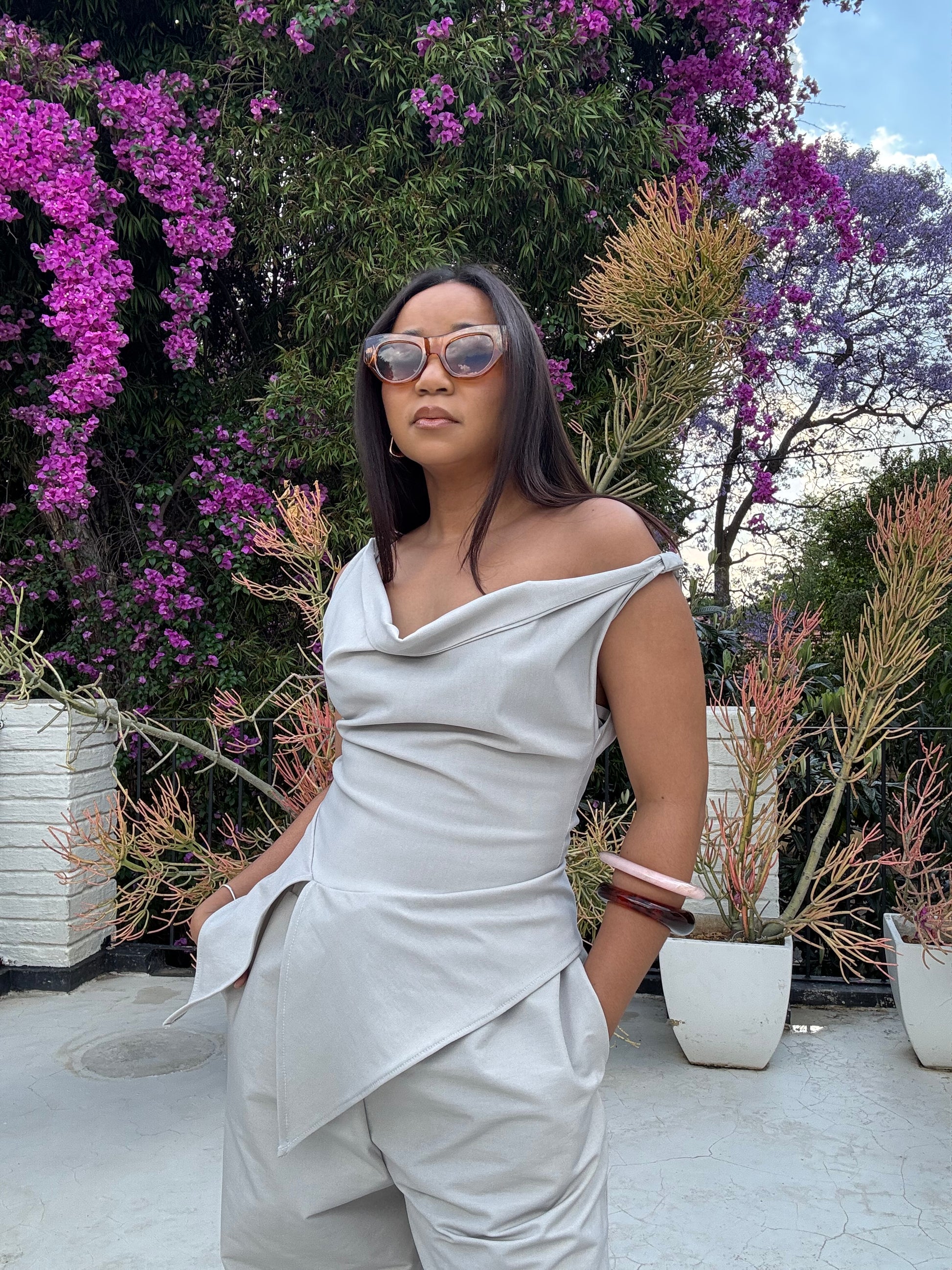 This May Set is the perfect addition to your wardrobe! Featuring a chic cowl neck line and stylish peplum top, this set offers both comfort and fashion. Complete with playful ballon elasticated pants, this set is perfect for any occasion. Stay on trend and make a statement with the May Set.